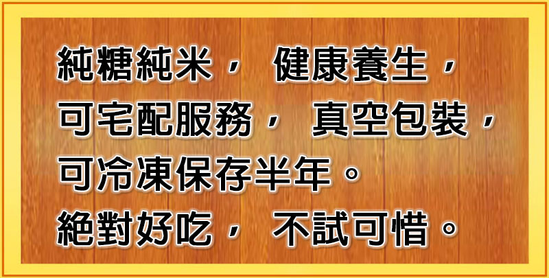 純糖純米,健康養生,可宅配服務,真空包裝,可冷凍保存半年。絕對好吃,不試可惜。
